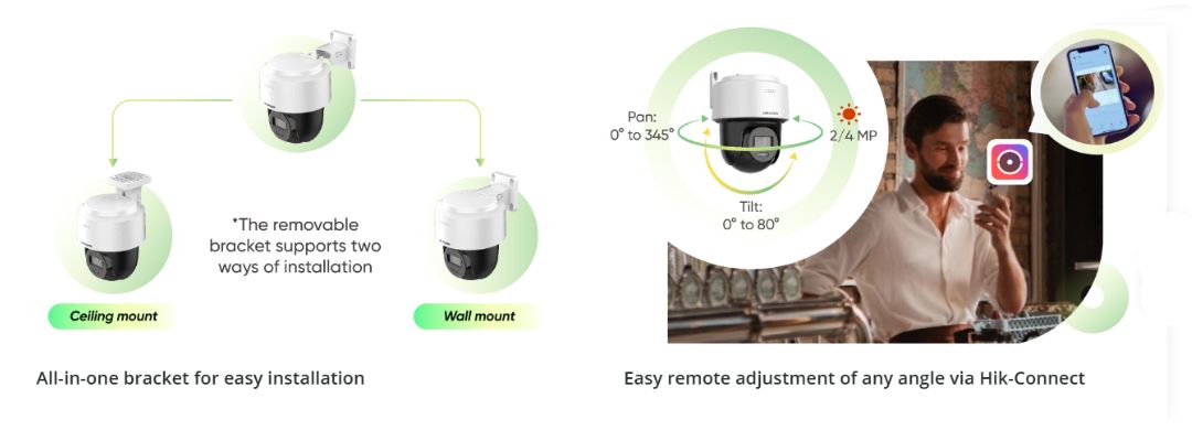 Hikvision’s new PT Cameras Pan and Tilt as users direct on their Hik-Connect mobile app, enabling remote and easy adjustment of camera viewing angles whenever they want.